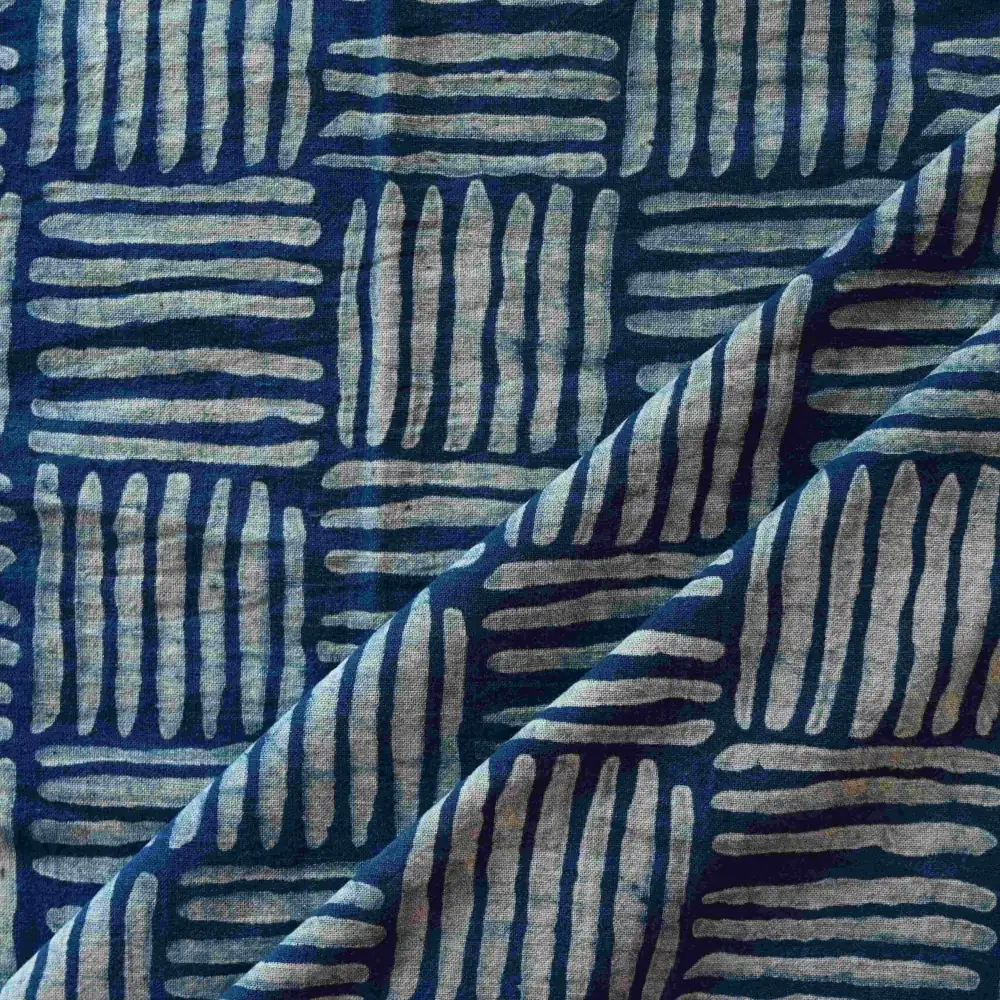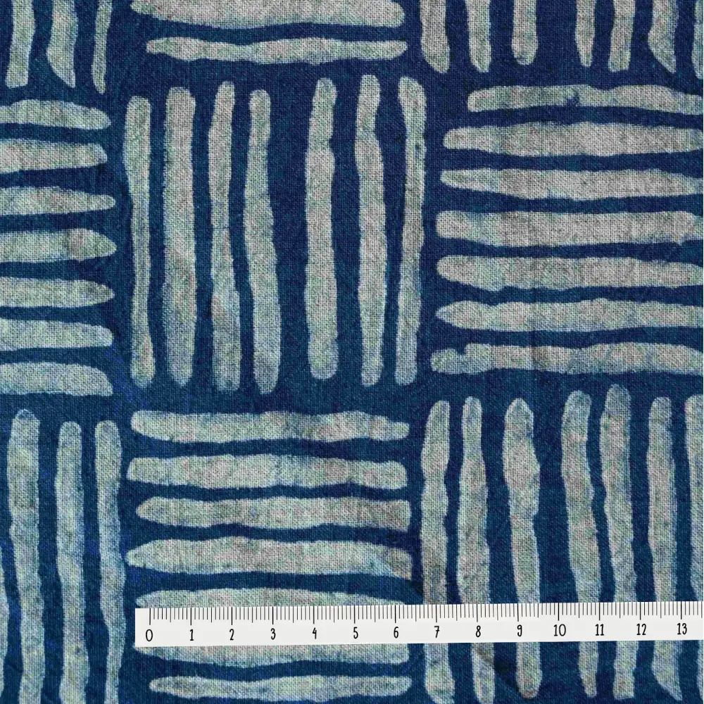 Le motif de ce tissu bleu indigo est imprimé à la main à l’aide de tampons en bois sculptés, selon une technique artisanale traditionnelle. Le dessin est composé de lignes fines et répétées : sept traits horizontaux forment un carré, auxquels répondent, en alternance, sept traits verticaux dessinant un second carré.